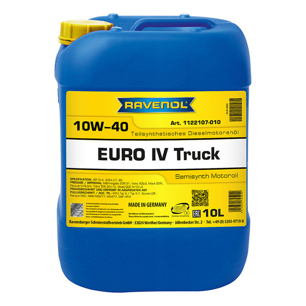 RAVENOL EURO IV Truck SAE 10W-40 jе универзално полусинтетичко моторно уље на бази синтетичког базног уља у комбинацији са најсавременијим адитивима за турбопуњаче и нетурбо дизел моторе тешких возила, аутобуса и специјалне опреме, као и за 4-тактне дизел моторе најновије генерације .